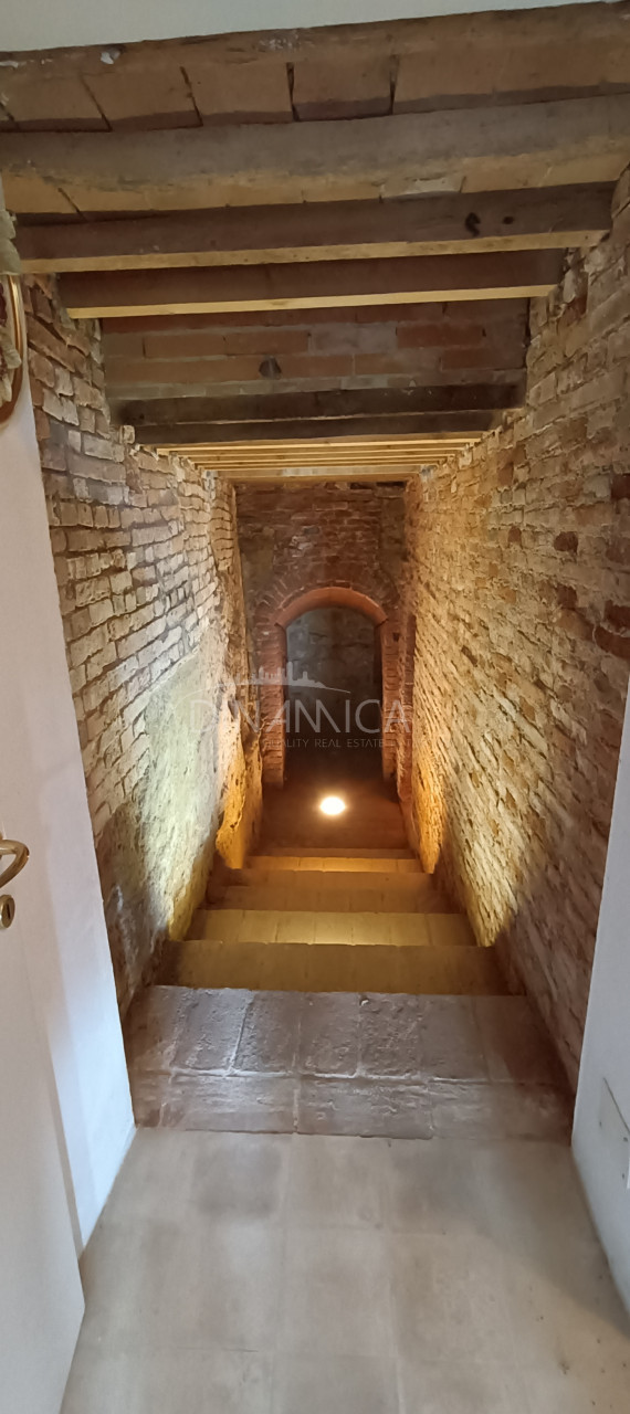 Dalla cucina, una scala in pietra ci permette d .. Continua i scendere al piano seminterrato, dove troviamo una cantina molto suggestiva, grazie alle sue pareti a vista interamente a mattoni, ottima per mantenere al fresco vini e salumi. Parallela alla cantina è posizionata anche una stanza ad uso taverna con la loggia che permette di accedere alla terrazza/resede e giardino per un totale di circa 139 mq. con ripostiglio.